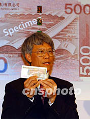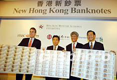 新鈔票共有五種面額,今日首次展示其中全新設(shè)計(jì)的一百港元及五百港元兩種面額的新鈔,將于二00三年十二月推出市面流通。其余二十港元、五十港元及一千港元三種面額的新鈔則定于二00四年下半年推出。