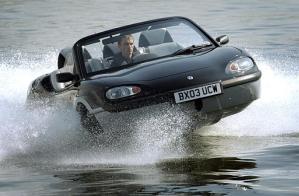 圖為一輛在泰晤士河上高速行駛的汽車(chē)。吉布斯科技生產(chǎn)的這輛水陸兩用汽車(chē)陸地時(shí)速100英里,水面時(shí)速30英里。(AP Photo/ Stefan Rousseau, PA)
