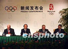 北京奧組委和第二十九屆奧運(yùn)會(huì)協(xié)調(diào)委員會(huì)四日在北京聯(lián)合舉辦新聞發(fā)布會(huì)。圖為第二十九屆奧運(yùn)會(huì)協(xié)調(diào)委員會(huì)副主席高斯帕(左一)、北京奧組委副主席蔣效愚(左二)、協(xié)調(diào)委員會(huì)主席海因-維爾布魯根(右二)、國(guó)際奧委會(huì)奧運(yùn)會(huì)執(zhí)行主任費(fèi)利(右一)在新聞發(fā)布會(huì)上。作者:張勤