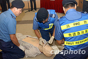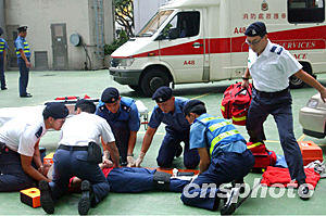 香港消防處,九月五日舉行先遣急救員計劃演練,在救護(hù)員尚未抵達(dá)事故現(xiàn)場時,為傷病者先行提供基本維生術(shù)。圖為消防先遣急救員進(jìn)行演練。中新社記者:錢興強(qiáng)