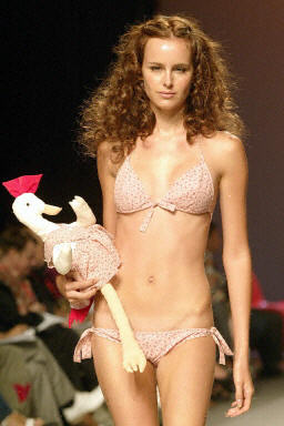9月8日,在西班牙巴塞羅納舉行了2004時尚春夏裝展示,模特現(xiàn)場展示了西班牙設(shè)計師TCN Toton Comella的性感比基尼。