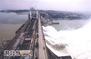 中新湖北網(wǎng)9月9日電 漢江第二次洪峰于八日凌晨一點到達丹江口水庫,最大洪峰流量達二萬八千五百立方米每秒,大約在今天下午五點丹江口水庫水位將達到一百五十六點七米,為一九八四年來最高水位。為緩解對水庫壓力,丹江口水庫開閘向下游泄洪。劉鐵軍 攝