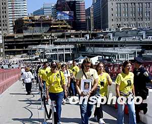 紐約十一日上午在世貿(mào)廢墟舉行“九一一”兩周年紀(jì)念儀式,數(shù)千紐約人走進(jìn)世貿(mào)廢墟最底層悼念罹難者。中新社記者:趙海燕
