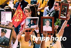 在“九一一”恐怖襲擊事件中逝去的紐約消防員親屬們,手舉親人的照片,參加在世貿(mào)中心遺址舉行的紀念活動。作者:龔文謨