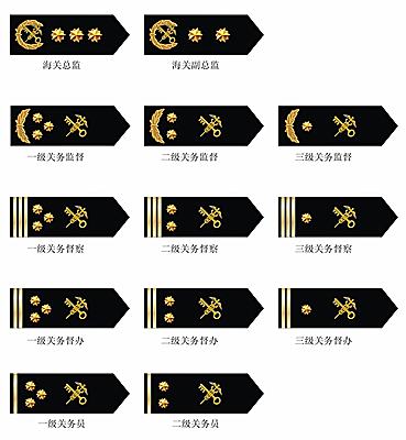 關(guān)務(wù)員關(guān)銜標志為一道橫杠和一枚海關(guān)關(guān)徽,一級關(guān)務(wù)員關(guān)銜標志為三枚星花;二級關(guān)務(wù)員關(guān)銜標志為二枚星花。