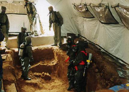 在“中方協(xié)助團(tuán)”防化專家的帶領(lǐng)下,記者穿戴好一整套厚重嚴(yán)密的防化服,戴好防毒面具,經(jīng)過作業(yè)保障區(qū),接受過防毒面具氣密性檢測后,進(jìn)入被稱為“高毒、高爆、高危險(xiǎn)”的作業(yè)污染區(qū)。