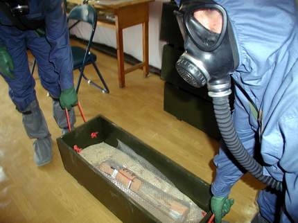 具體的處理程序是:金屬探測————先通過電磁探測,測出毒彈掩埋的準(zhǔn)確邊際,確定挖掘的方位;挖掘作業(yè)————使用銅針、銅鏟等器具,小心將已經(jīng)銹蝕、滲漏的毒氣彈挖掘出來;冷卻處理————將挖掘出的毒氣彈放置到零下40℃的冷藏柜,進(jìn)行12個(gè)小時(shí)的冷卻,使毒氣彈溫度降到零下30℃;X光鑒別————通過大功率X光鑒別,搞清楚毒彈內(nèi)部結(jié)構(gòu);彈、藥分離———將彈體切割;外形鑒別;密封包裝。