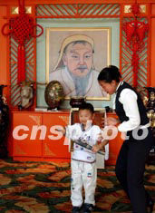 吉林省松原市郊的查干湖畔如今新建了許多觀光蒙古包,年幼的蒙古族男孩在中國(guó)元代英雄成吉思汗的肖像前持刀照相。成吉思汗的蒙古鐵騎大軍曾經(jīng)馳騁歐亞大陸而名垂青史。中新社記者:賈國(guó)榮