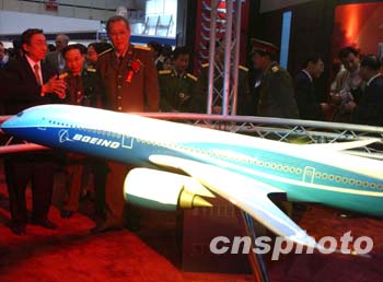 九月十七日在北京開幕的國際航空展上,美國波音公司的代表邀請中國的解放軍高級將領(lǐng),一起觀看首次揭秘的新型波音7E7夢想飛機模型。中新社記者:賈國榮