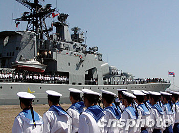 9月20日,俄羅斯海軍“潘捷列耶夫海軍上將”號大型反潛艦,在太平洋艦隊(duì)副司令科涅夫·亞歷山大·瓦西里耶維奇中將率領(lǐng)下抵達(dá)青島港。圖為歡迎俄艦來訪的中國海軍官兵。鄒山 攝