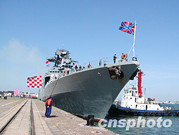 9月20日,在太平洋艦隊(duì)副司令科涅夫·亞歷山大·瓦西里耶維奇中將率領(lǐng)下,俄羅斯海軍“潘捷列耶夫海軍上將”號大型反潛艦抵達(dá)青島港。鄒山 攝