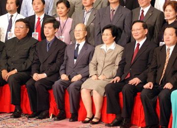 國務(wù)委員唐家璇(右二)二十一日接見“第二屆世界華文傳媒論壇”與會(huì)代表并合影留念。中新社 張宇 攝