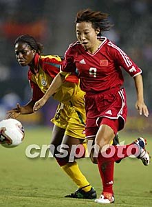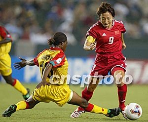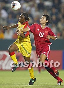 美國當(dāng)?shù)貢r間9月21日晚8點(diǎn),中國女足參加了第四屆女足世界杯小組賽首場比賽,比賽對手是非洲勁旅加納隊,中國女足憑借老將孫雯的頭球以1比0戰(zhàn)勝加納隊,取得開門紅。 中國隊19號韓端與加納隊員爭頂。作者:劉占坤