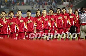 美國當(dāng)?shù)貢r間9月21日晚8點(diǎn),中國女足參加了第四屆女足世界杯小組賽首場比賽,比賽對手是非洲勁旅加納隊,中國女足憑借老將孫雯的頭球以1比0戰(zhàn)勝加納隊,取得開門紅。圖為中國女足首發(fā)隊員面對國旗齊唱國歌。作者:劉占坤
