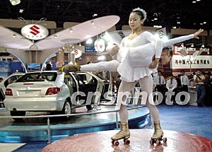 兩位雜技小演員九月二十五日在北京國際商用車展覽會中的湖北東風(fēng)雪鐵龍展臺上,展示圓桌輪滑高超技藝,為愛麗舍(Elysee)X與SX型新車促銷表演。作者:鄒憲