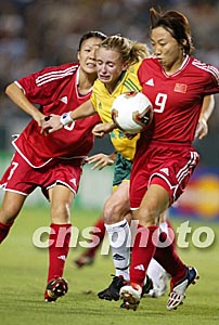 美國當(dāng)?shù)貢r間9月25日19點,參加2003年第四屆女足世界杯D組比賽的中國隊在洛杉磯南部卡森的The Home Depot Center體育場舉行小組賽的第二場比賽,對手是澳大利亞隊。上半場中國隊先失一球,下半場開場白潔將比分扳平。隨后,中國隊占有優(yōu)勢但沒能抓住機(jī)會擴(kuò)大戰(zhàn)果。作者:劉占坤