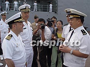 美國艦艇編隊(duì)于九月二十六日上午結(jié)束對(duì)中國南海艦隊(duì)的訪問離開湛江港。圖為中國南海艦隊(duì)參謀長侯月喜少將與美艦艦長話別。作者:李小軍