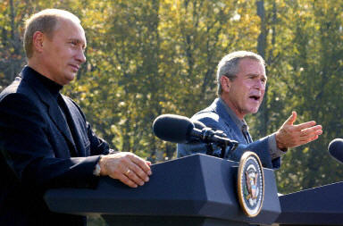 美國總統(tǒng)布什與俄羅斯總統(tǒng)普京27日舉行了會談。在會談后的一個新聞會上,兩國領(lǐng)袖呼吁朝鮮停止他們的被認(rèn)為是核武發(fā)展計劃的項目,敦促伊朗與國際原子能機構(gòu)合作。