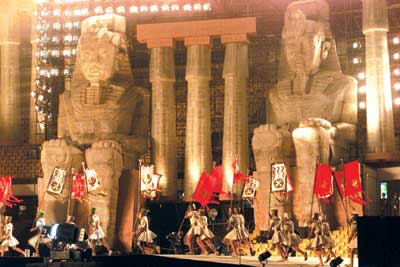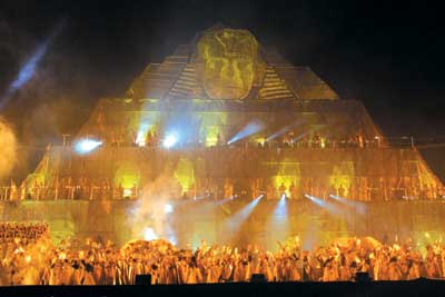 夜色中,雄偉的埃及金字塔在絢麗的燈光映襯下顯得格外迷人。歡呼的人群,凱旋的勇士,齊放的禮花,昨晚工體數(shù)萬觀眾在這里領略了世界上最大場面的演出。