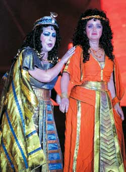 盡管專業(yè)氣象臺一直預報演出時無雨,但是昨天一天的天氣都十分陰沉,讓人不禁為這場演出捏了一把汗?墒抢咸煊醒郏搅税頃r天氣變得格外的好。當晚八時,《阿依達》在萬眾企盼中終于熱鬧開場。一陣優(yōu)美的前奏之后,美麗的埃塞俄比亞公主阿依達翩然出場。金字塔在絢麗燈光的映襯下,透著迷人的光暈。冰島男高音歌唱家克里斯蒂安·約翰遜扮演的男主角拉達梅斯、意大利著名男低音歌唱家佳尤蒂扮演的大祭司等劇中角色依次出場,洪亮的嗓音和優(yōu)美的唱腔不時博得觀眾的陣陣掌聲。
