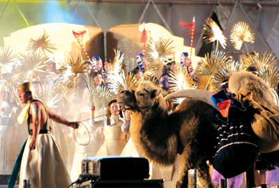 當晚演出的高潮出現(xiàn)在第二幕第二場。在雄壯有力的凱旋進行曲聲中,兩千名由武警戰(zhàn)士扮演的身穿戰(zhàn)袍的勇士邁著整齊的步伐走過這個世界上最大的舞臺,上千名歡慶勝利的群眾在舞臺上載歌載舞,而繳獲的戰(zhàn)利品——駱駝、老虎、獅子等動物明星們的出場以及在體育場看臺四周齊放的絢麗的煙花更增添了歡慶的節(jié)日氣氛。這時,工人體育場一下子沸騰了,觀眾們被眼前盛大的場景深深感染了,臺上臺下歡呼聲響成一片,首屆北京國際戲劇演出季掀起了第一個高潮。