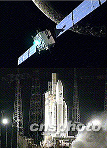 歐洲第一個(gè)月球探測器“靈敏-1”號(hào),于北京時(shí)間周日上午7點(diǎn)14分搭乘歐洲“阿麗亞娜-5”型火箭從法屬圭亞那地區(qū)庫魯航天中心成功發(fā)射升空。與“靈敏-1”號(hào)同時(shí)發(fā)射升空的還有兩枚商用衛(wèi)星。預(yù)計(jì)15個(gè)月后,重370公斤的“靈敏-1”號(hào)探測器,將到達(dá)繞環(huán)月軌道,在月球軌道上工作30個(gè)月。中新社圖