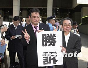 侵華日軍遺棄化武受害者索賠訴訟首獲勝訴之后,中國原告與長期幫助支持訴訟活動的日本市民后援團體人士相互祝賀。作者:王健