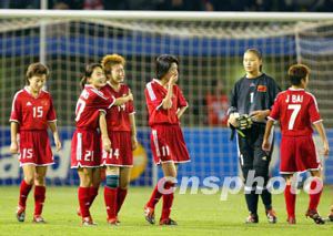過(guò)早的失球并沒(méi)有讓中國(guó)隊(duì)自亂陣腳,中國(guó)隊(duì)依靠整體配合向?qū)Ψ疥嚨匕l(fā)起猛攻,創(chuàng)造了多次得分機(jī)會(huì)。第八分鐘,中國(guó)隊(duì)在對(duì)方禁區(qū)右前方獲得一次任意球機(jī)會(huì),孫雯主罰,以一記漂亮的“香蕉球”越過(guò)人墻,球打在橫梁上彈出;十二分鐘,白潔在對(duì)方小禁區(qū)前沿頭球攻門偏出;十六分鐘,孫雯在對(duì)方禁區(qū)內(nèi)得球,連續(xù)晃動(dòng)后一腳打門,球貼著球門立柱出了底線;三十六分鐘,孫雯在非常困難的情況下將球傳給插入禁區(qū)的畢妍,后者倉(cāng)促起腳,錯(cuò)失了一次破門的絕佳機(jī)會(huì)。