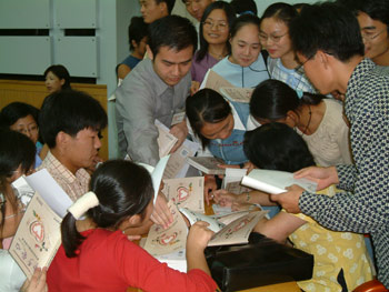 演講結(jié)束后,采訪團向合工大贈送了來自民間的思悟錄——〈牽手愛心〉,大學(xué)生們將“愛心之旅”成員周永琴、趙玉芝、宋體金、李繁民團團圍住,請他們簽字留念。(華夏時報圖 大漠?dāng)z)