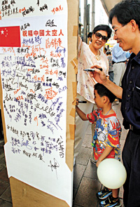 一位與父母剛逛完街預(yù)備回家的9歲男童施俊匡,在祝福卡紙上簽名支持及祝福航天員。而爸爸施先生亦認(rèn)同,中國載人宇宙飛船升空是中國人的驕傲,因此希望簽名送上一點(diǎn)祝福。
