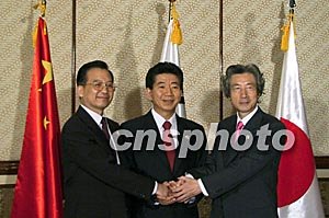 溫家寶表示,中日韓三國合作基礎(chǔ)良好,發(fā)展?jié)摿薮。去年三國?jīng)貿(mào)合作保持強(qiáng)勁勢頭,信息產(chǎn)業(yè)、環(huán)保、人力資源和文化等領(lǐng)域的合作發(fā)展很快。三方還就防治非典開展了良好的合作,開辟了公共衛(wèi)生合作新領(lǐng)域。