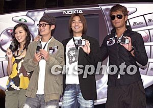 諾基亞N-Gage手提游戲機(jī)10月7日在香港舉行推廣活動,大會特別邀請演藝界喜好“打機(jī)一族”古天樂、馮德倫、余文樂、李蘢怡(右起)出席活動,諾基亞N-Gage除具備三頻通訊功能外,更有流動游戲機(jī)功能。作者:鄧慶樂