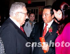 美東時間十月九日晚,美國前國務(wù)卿基辛格(左)來到紐約華爾道夫酒店,祝賀中國最大的上市銀行——招商銀行在美國設(shè)立代表處。中新社記者:陳建