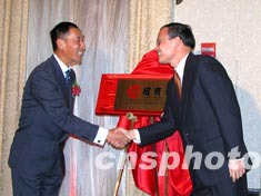 圖為揭牌儀式上,中國駐紐約總領(lǐng)事劉碧偉(右)向招商銀行董事長秦曉(左)表示祝賀。