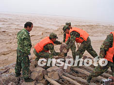 十月十二日,濟(jì)南軍區(qū)官兵在河南蘭考的黃河灘三十五號壩砌石固堤岸。黃河下游蘭考三十五號壩是蘭考灘區(qū)的重點(diǎn),一旦被沖垮,黃河被撕開的“口子”就會越來越大,危及蘭考灘區(qū)和下游的山東,后果不堪設(shè)想。目前各種搶險(xiǎn)物資已基本運(yùn)送到位,但由于降雨,水位有上漲趨勢,給防洪搶險(xiǎn)工作帶來一定的難度。作者:慎重