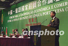 中國-葡語國家經(jīng)貿(mào)合作論壇(澳門)十二日在澳門舉行,澳門特區(qū)行政長(zhǎng)官何厚鏵在開幕式上致辭。中新社記者:李剛