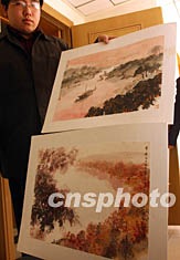 中貿(mào)圣佳國際拍賣公司2003年拍賣會將于十一月一日在北京舉行,傅抱石作品《毛主席詩意山水冊八開》等稀罕珍品成為拍品中一道靚麗風景。該畫作由傅抱石先生在1964、1965年內(nèi)為生前摯友維楨所繪,是作者經(jīng)心閱讀《毛澤東詩詞》后激情創(chuàng)作的八幅佳構。圖為工作人員十月中旬展示其中的兩幅《寥廓江天萬里霜》(下)與《芙蓉國里盡朝暉》。中新社記者:武仲林