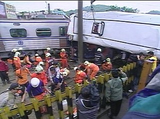 中新網(wǎng)10月14日電 今天上午臺北縣鶯歌東鶯里平交道發(fā)生游覽車與臺鐵電車相撞重大事故。而在去年7月20日,同樣在東鶯里平交道也有拖板車與“自強”號相撞事故,而這兩起重大平交道事故,臺鐵裝置的緊急按鈕都因民眾不清楚而未及時激活。