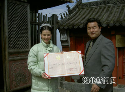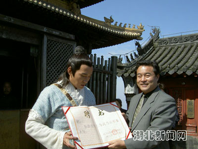李、焦二人接過聘書說:“一定不辱使命,向中外宣傳武當(dāng)山靈氣,為讓武當(dāng)山連同電視劇《武當(dāng)》走向世界鞠躬盡力!”(郭占柱攝影報道)