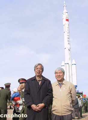 “神舟”五號載人飛船總設(shè)計師戚發(fā)軔(右)和“神箭”——長征二號F運載火箭總設(shè)計師劉竹生在箭船塔組合體垂直轉(zhuǎn)運現(xiàn)場合影留念。中新社記者孫自法攝