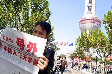 十五日上午,中國(guó)自行研制的“神舟”五號(hào)載人飛船,在酒泉衛(wèi)星發(fā)射中心發(fā)射成功,這一歷史性時(shí)刻受到中國(guó)億萬(wàn)人民的關(guān)注。圖為上海市民關(guān)注發(fā)射成功的新聞報(bào)道。作者:湯彥俊