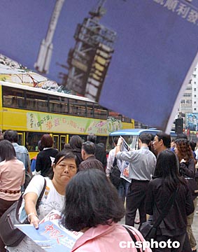 中國“神舟”五號(hào)十月十五日上午九時(shí)在酒泉衛(wèi)星發(fā)射中心成功升空,香港市民關(guān)注“神舟”五號(hào)首次載人發(fā)射成功。中新社記者:錢興強(qiáng)