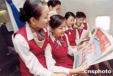 十月十六日,中國首次載人航天飛行取得圓滿成功,上海航空公司的空姐爭看有關(guān)報道,分享中國人首次上太空的喜悅。作者:夏本建