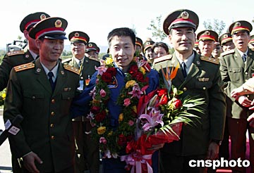 十月十六日上午,中國(guó)首位航天員楊利偉回到北京航天城,與另兩位航天員梯隊(duì)成員會(huì)合。作者:張桐勝