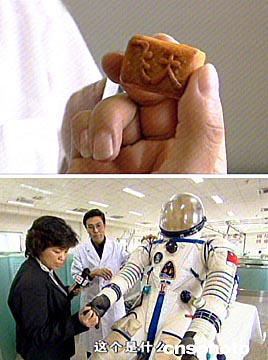 16日,北京新聞媒體記者在中國首次載人航天飛行取得圓滿成功之時參觀北京航天城,觀看中國自制的航天服和具有中國特色的航天食品——特制飛天月餅。中新社圖