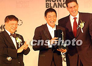 2003年萬寶龍國際藝術(shù)贊助大獎十月十七日在香港舉行頒獎儀式,圖為萬寶龍亞太區(qū)主席詹兆安和萬寶龍文化基金會香港顧問盧景文為劉德華頒發(fā)大獎。中新社記者:錢興強