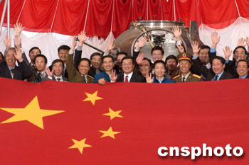 十月十八日,中國(guó)“神舟”五號(hào)載人飛船返回艙搭載物品開(kāi)艙儀式在中國(guó)航天科技集團(tuán)公司北京空間技術(shù)研制試驗(yàn)中心舉行。隨載人飛船在太空翱翔二十多小時(shí)的巨幅五星紅旗從神舟五號(hào)載人飛船返回艙中被取出。中新社記者 張煒攝