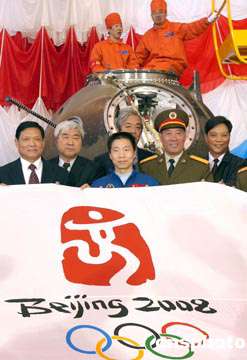 中午十二時,當北京奧組委主席劉淇從中國航天科技集團公司總經(jīng)理張慶偉手中接過這面不尋常的旗幟時,全場報以熱烈掌聲。今年八月底,中國航天科技集團公司向北京奧組委發(fā)函,商請在“神舟”五號上搭載二00八年奧運會會徽旗幟。這個建議得到了積極而迅速的響應。九月中旬,一面精心制作的印有“中國印·舞動的北京”圖案的大幅白色會旗正式交付中國航天科技集團公司。十月十五日九時,這面旗幟搭乘“神舟”五號踏上了遨游太空的旅程,并于十六日六時二十三分安全返回地面。