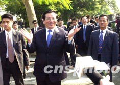 今天的澳門,陽(yáng)光燦爛,氣候宜人。大三巴牌坊前,游客游興正濃。九時(shí)十分左右,曾慶紅在唐家璇、廖暉、何厚鏵等陪同下,來(lái)到大三巴牌坊參觀。眾多游客見到國(guó)家領(lǐng)導(dǎo)人,立刻涌向前來(lái)。曾慶紅熱情地向大家打招呼:“大家好!”