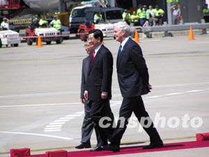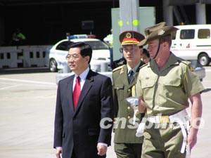 中國國家主席胡錦濤和夫人22日上午10時許抵達(dá)悉尼國際機(jī)場,對澳大利亞進(jìn)行國事訪問,受到澳聯(lián)邦總督杰弗里和總理霍華德等熱烈歡迎。中新社記者 劉雨生 攝